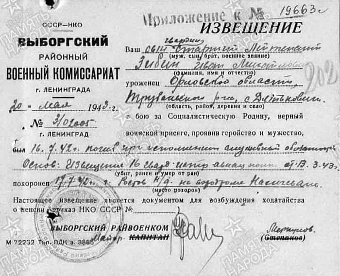 Увековечен в печатной Книге Памяти Брянской области и печатной Книге Памяти г. Ленинграда том 5.