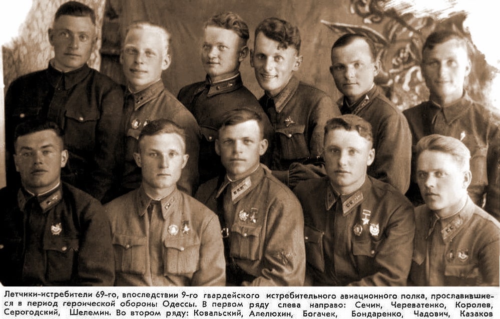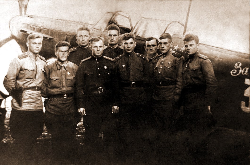 Лётчики у истребителя на аэродроме Солонец-Поляна (в настоящее время территория Новооскольского городского округа), лето 1943 года. Слева-направо: 2-й - старший лейтенант, заместитель командира эскадрильи Сечин Григорий Митрофанович , 3-й - летчик Вдовкин Фёдор Павлович , 4-й - старший лейтенант, командир эскадрильи Корниенко Иван Михеевич , 5-й - младший лейтенант, летчик Подсвиров Владимир Иванович, 6-й - лейтенант Андрианов Илья Филиппович , 7-й - младший лейтенант, летчик Мерквиладзе Гарри Александрович
