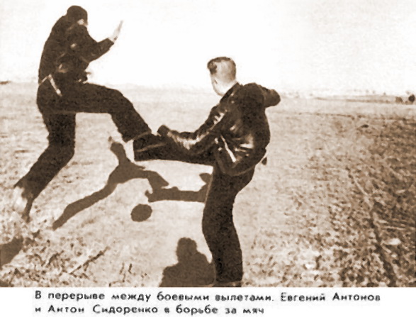 «...Широкоплечий, крепкий Антон Сидоренко сложением был под стать Серову. Опытный воздушный боец, он полтора месяца назад в районе Мадрида был тяжело ранен в лицо осколками зенитного снаряда. После излечения в госпитале Сидоренко категорически отказался уехать в Советский Союз: «У меня свои счёты с фашистами». Вместо Якушина он был назначен командиром звена...»