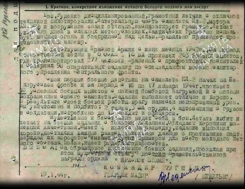 С 10.01.1044 воевал на Ил-2 в 79-м гвардейском штурмовом авиационном Мозырьском полку 2-й гвардейской штурмовой авиационной Черниговско-Речицкой Краснознамённой дивизии. К 17.01.1944 выполнил десять боевых вылетов, а 19.01.1944 был представлен к награде – ордену Красного Знамени.