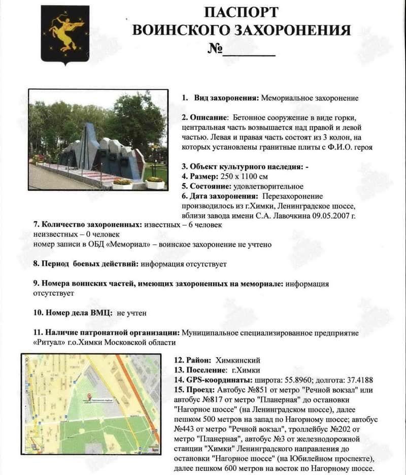 Химкинский военный мемориал - памятник двум советским лётчикам и четырём красноармейцам. Мемориал и могилы изначально находились недалеко от Ленинградского шоссе, главной магистрали, ведущей из Москвы в международный аэропорт Шереметьево. Останки лётчиков и солдат были эксгумированы с санкции властей Химок в апреле 2007 года и позже перезахоронены с воинскими почестями на мемориале на Аллее Героев Новолужинского кладбища в центре Химок.