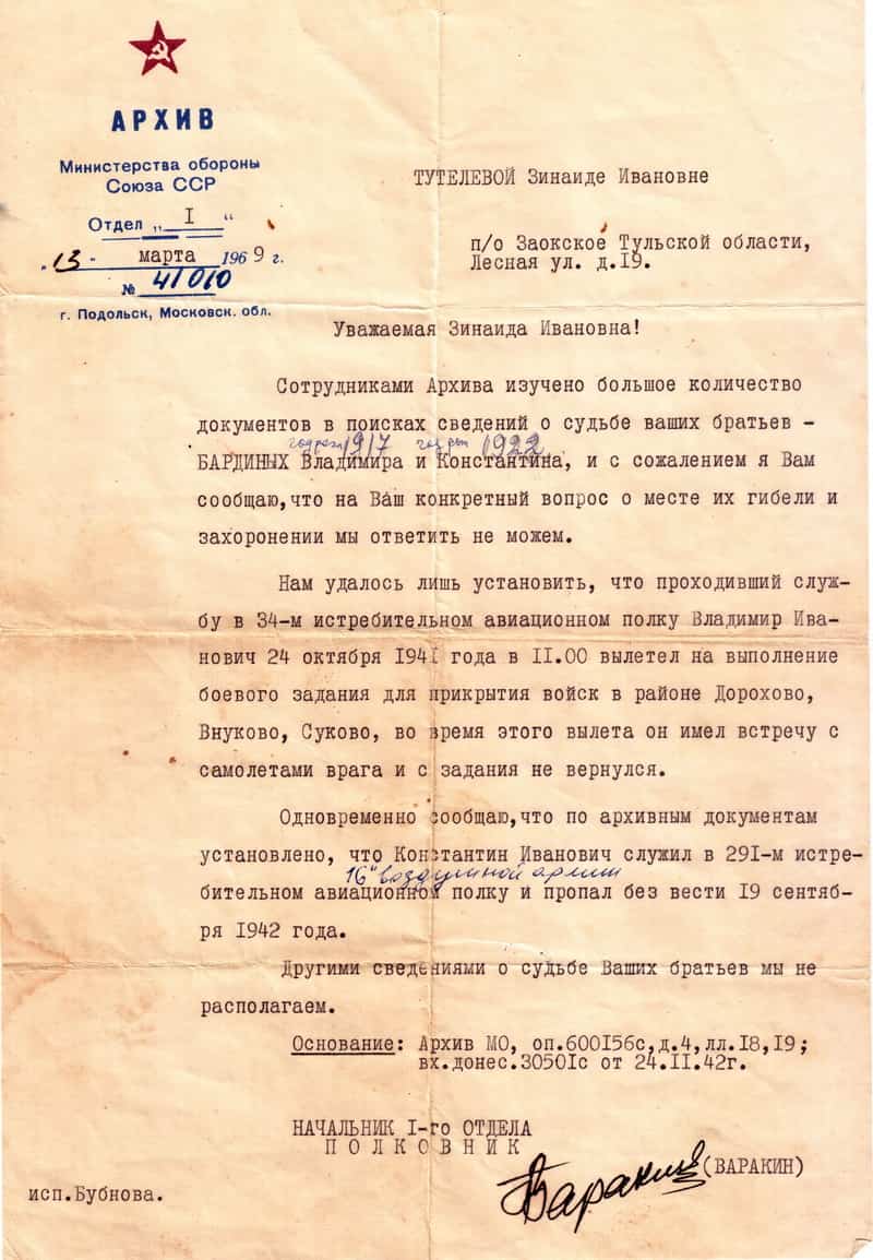 Мать Бардина Татьяна Захаровна и отец Бардин Иван проживали в г. Москва-15 по адресу ул. Бутырская д. 34 кв. 7.