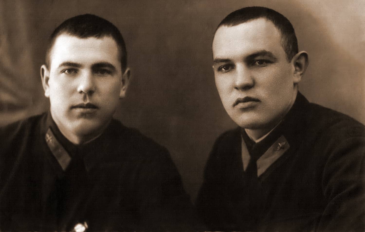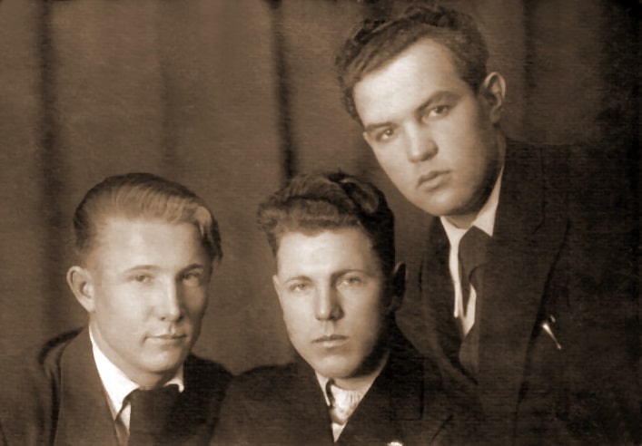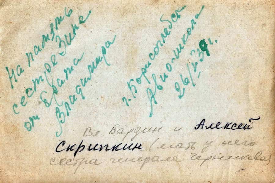 Три друга, земляка, вскоре лётчики-выпускники Борисоглебского училища Павел Новиков (д. Вишенки Заокского района Тульской области), в середине Бардин Володя, стоит Скрипкин Алексей (д. Яковлево Заокского р-на Тульской области). Новиков Павел после окончания училища остался преподавать в нём же.