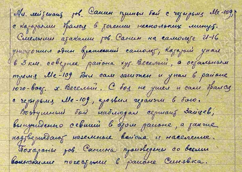 Несколько дней деталь за деталью, осколок за осколком доставали мы из земли легендарного "ишачка". Разбитые лопасти винта, погнутые пулеметы ШКАС, сгоревший движок, фрагменты приборной доски и штурвала. По всему получалось, что самолёт был сделан на 458-м заводе в Ростове-на-Дону. Цеха завода в Донской столице собрали и выпустили на защиту мирного неба более 350-ти истребителей Н-16. Найденный нами самолёт принадлежал 76-й сводной свиадивизии. Летал на нём замечательный пилот мл. лейтенант Тимофей Никитович Санин, командир звена 446-го истребительного полка. Лётчик, прославившийся своей смелостью в боях за Донское небо. Не раз Тимофей выходил победителем из схваток с мессерами, считаясь в полку мастером скоростных горизонтальных маневров. Накануне своего последнего вылета лейтенант Санин с товарищами видели на ж.д. станции Батайск расстрелянный фашистскими самолётами санитарный эшелон с нашими раненными. На крышах вагонов были красные кресты... Многие вагоны сгорели вместе с бойцами, которые не могли выбраться из огня.