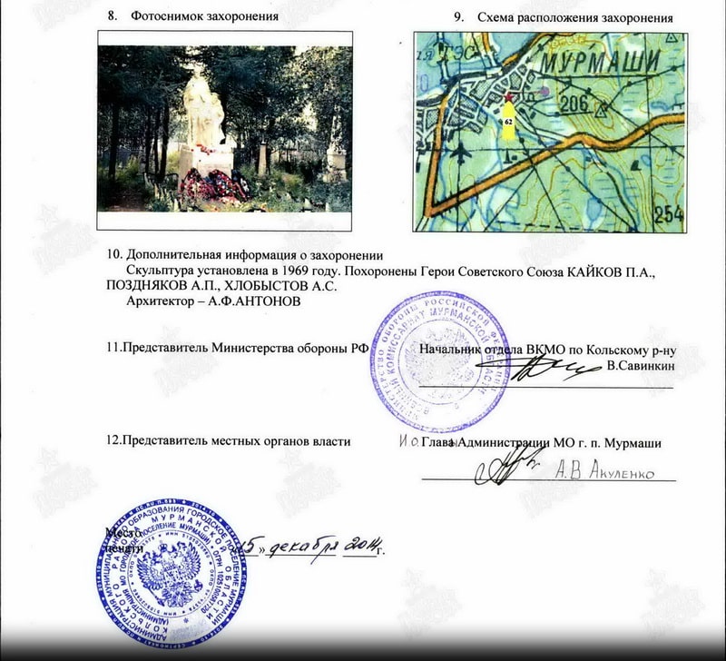 Захоронен в Братской могиле п. Мурмаши Кольского района Мурманской области (захоронение № 33109010).