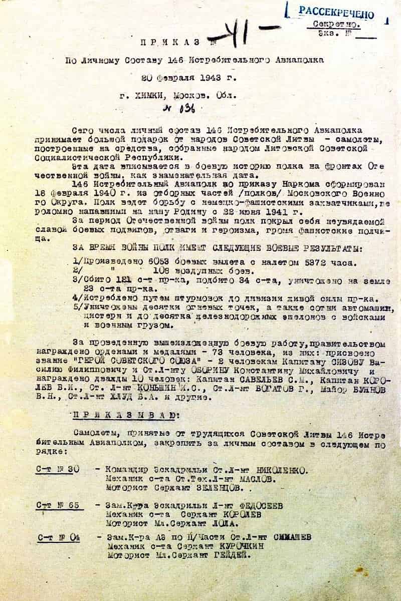 20 февраля 1943 года в торжественной обстановке 146-й истребительный авиаполк пополнился ещё одной авиаэскадрильей из 12 самолётов Як-7Б, которые были приобретены за деньги, собранные эвакуированными жителями Литвы.