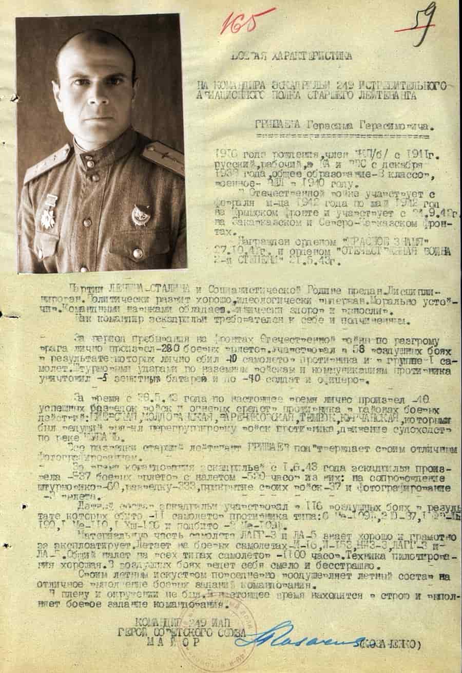 ...В Темрюкском историко-археологическом музее хранится записная книжка лётчика истребительной авиации старшего лейтенанта Герасима Герасимовича Гришаева, которую после его гибели хранила, а затем передала в музей его вдова. Книжка небольшого формата, 7 на 10 сантиметров, сохранилась она не полностью – отсутствует обложка и часть страниц. Записи велись аккуратным мелким почерком, чаще карандашом, иногда чернилами. В этой книжке Гришаев не только регистрировал свои боевые вылеты и записывал их результаты. Здесь присутствуют и тактико-техническое описание советских истребителей И-153 «Чайка» и ЛАГГ-3, на которых воевал Герасим Герасимович, и различные физические и математические формулы, необходимые для боевого лётчика, и фамилии и должности сослуживцев, и данные о боевых отравляющих веществах и средствах защиты от них, а также информация личного характера.