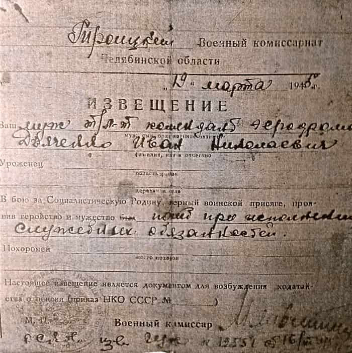 Семья осталась на Урале до окончания войны. Помогал ей выжить в это время старший сын – Николай Иванович Дьяченко, однако 25.02.1945 погиб и он.
