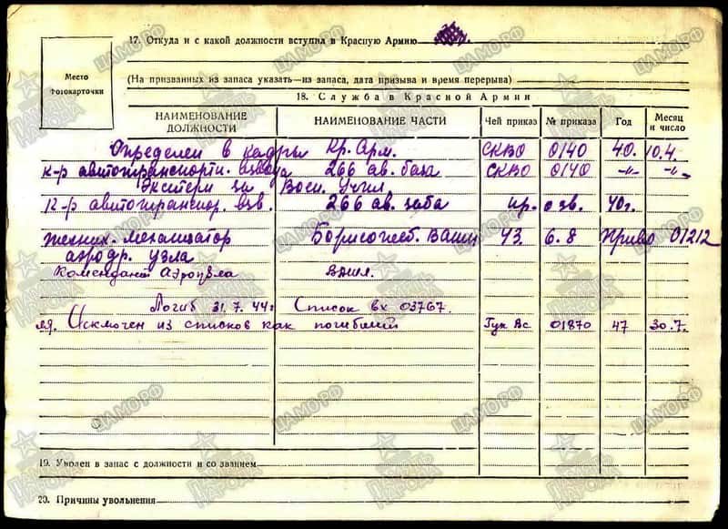 Исключен из списков Вооруженных Сил Союза ССР Приказом Главного управления кадров ВС СССР № 0180 от 30.07.1947.