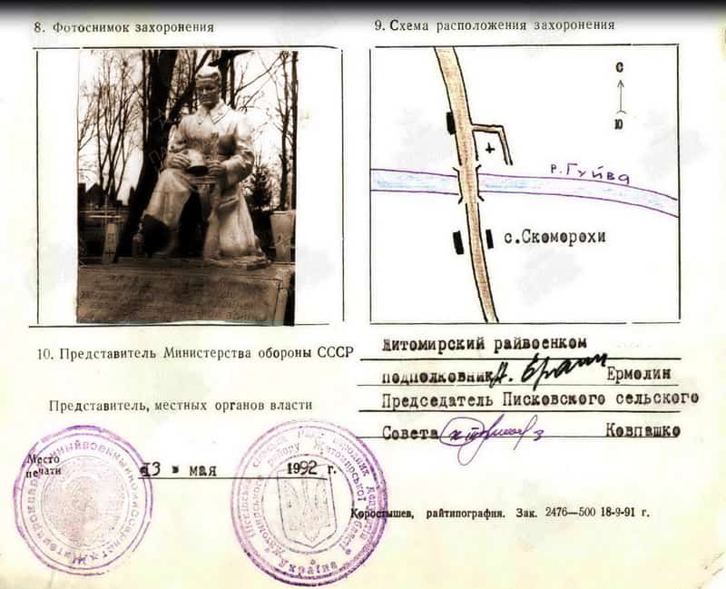 Похоронен в Братской могиле № 4 на сельском кладбище с. Скоморохи Житомирского района Житомирской области (в списке захороненных указана дата гибели 01.03.1944).
