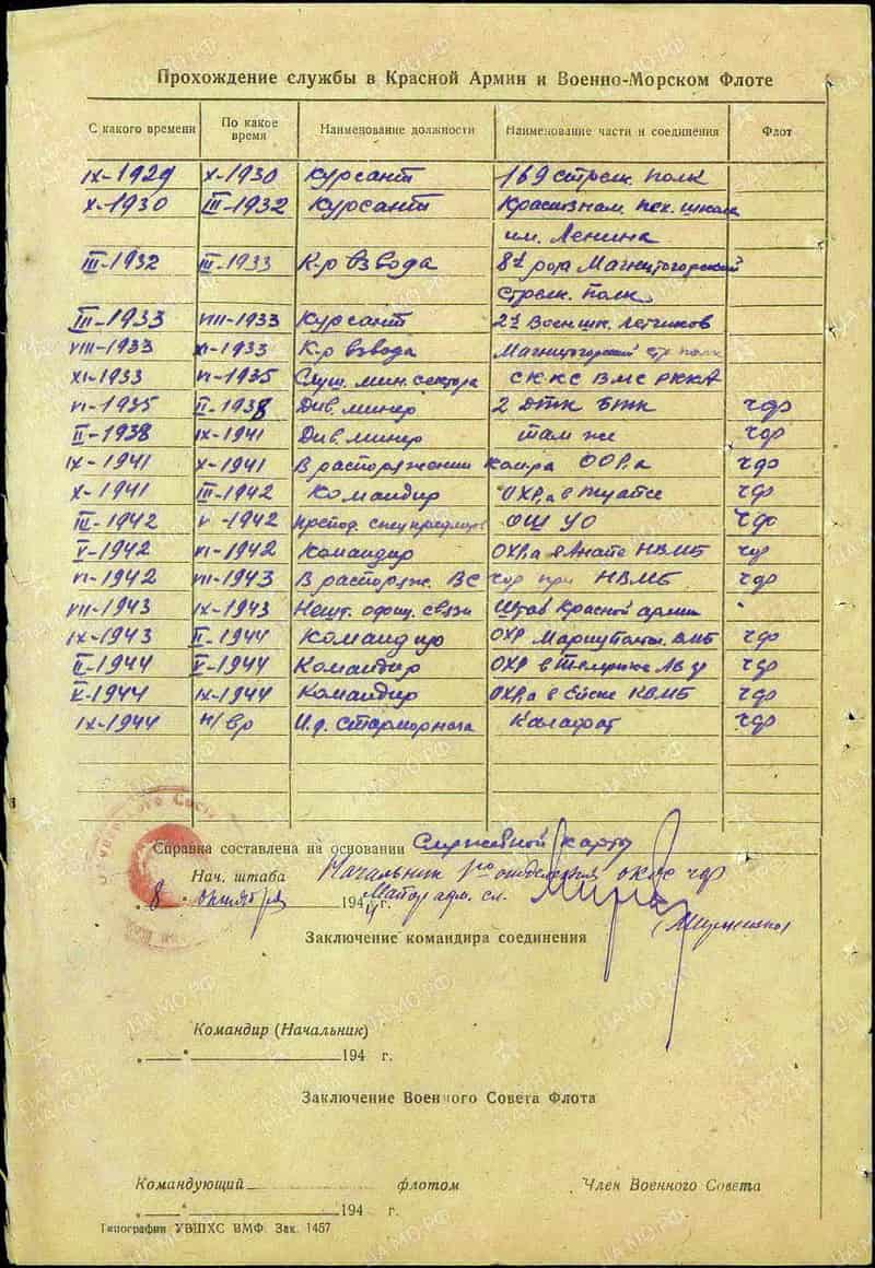 С сентября 1929 по октябрь 1930 (по данным наградного листа) — курсант 169-го стрелкового полка.