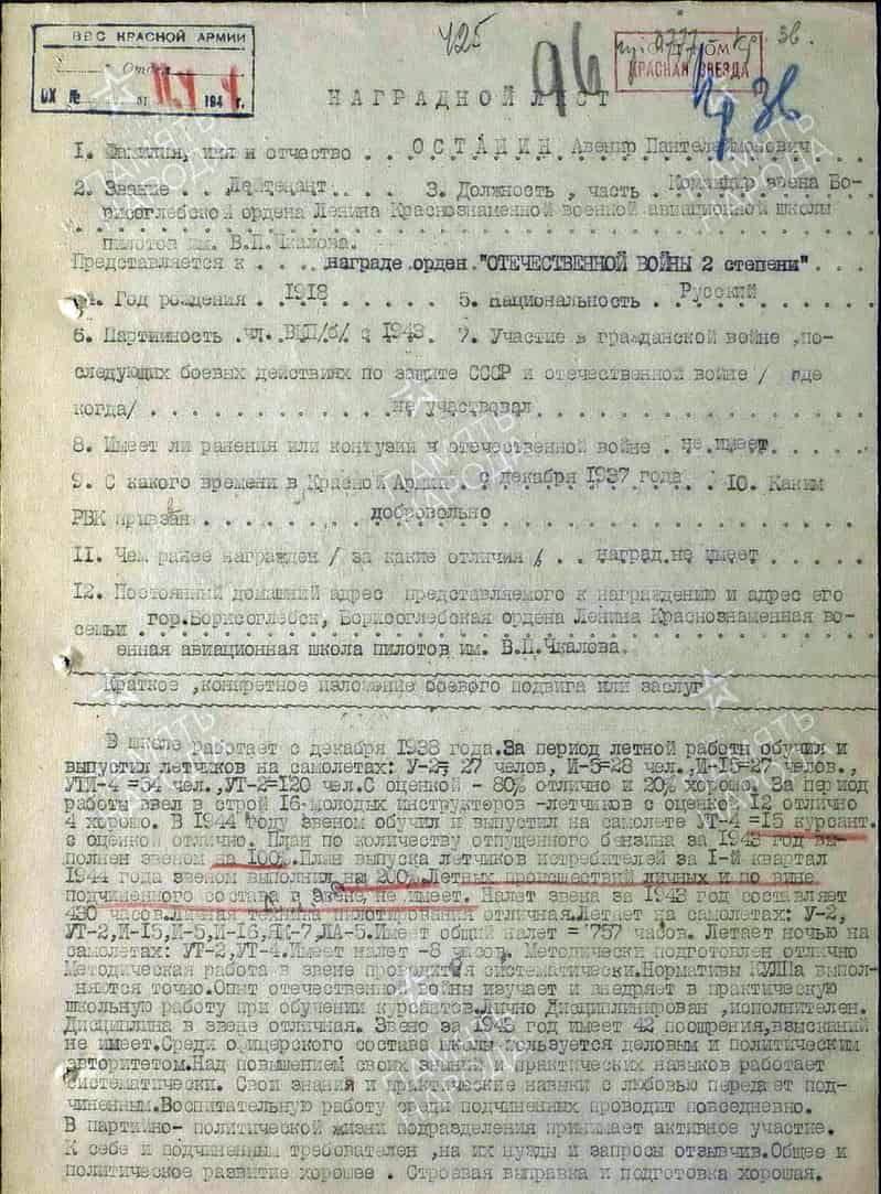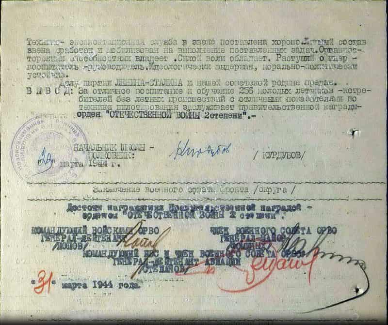 В марте 1944 года командир звена Борисоглебской ВАШП имени В.П. Чкалова лейтенант Останин А.П. представлен к награде: