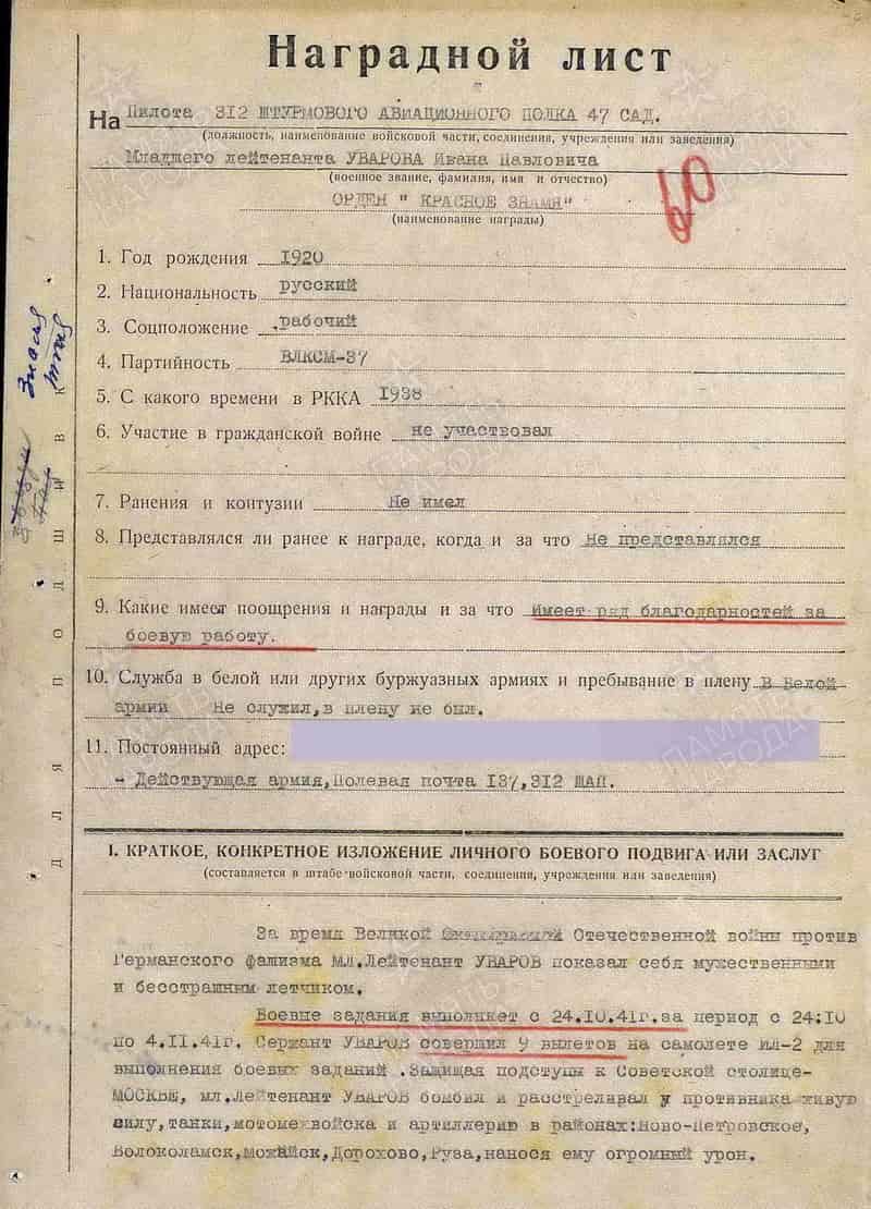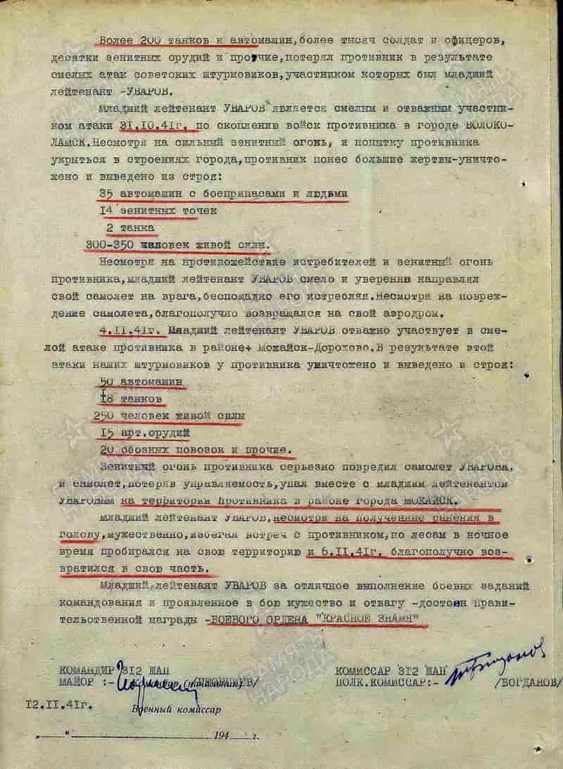 12.11.1941 пилот 312 шап 47 сад младший лейтенант Уваров И.П. представлен к награде.