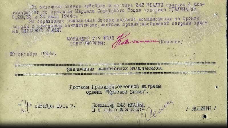 На 20.10.1944 (по данным наградного листа) — старший лейтенант, заместитель командира эскадрильи 717 лбап.