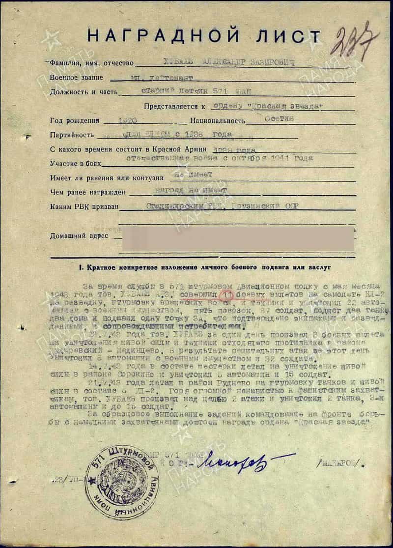 23.07.1943 старший лётчик 571 шап младший лейтенант Хубаев А.З. представлен к награде за выполненные 11 боевых вылетов: