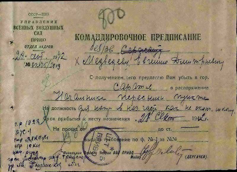 28.09.1942 командировочным предписанием № ок 45/2809 отдела кадров Управления ВВС Приволжского ВО (г. Саратов) Медведеву Е.Д. (без звания, зачёркнуто сержанту) предписано убыть в распоряжение начальника Саратовского пересыльного пункта для направления в наземную часть, как не окончившему школу (авиационную), со сроком прибытия в тот же день.