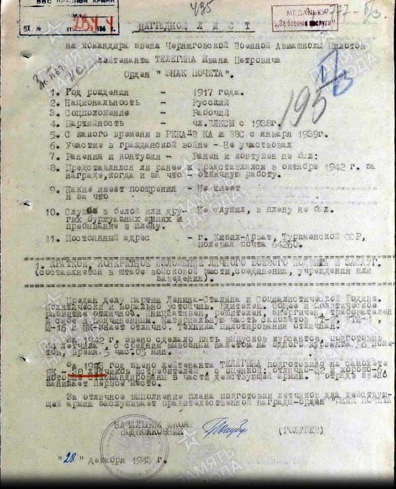 28.12.1943 командир звена Черниговской ВАШП лейтенант Телегин И.П. представлен к награждению орденом «Знак Почета».