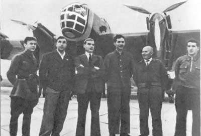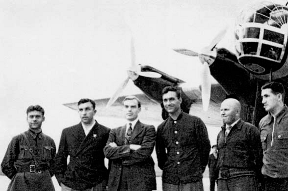 Слева направо: радист Н. Я. Галковский, второй пилот Н. Г. Кастанаев, командир корабля С. А. Леваневский, бортмеханики Г. Т. Побежимов, Н. Н. Годовиков, штурман В. И. Левченко.