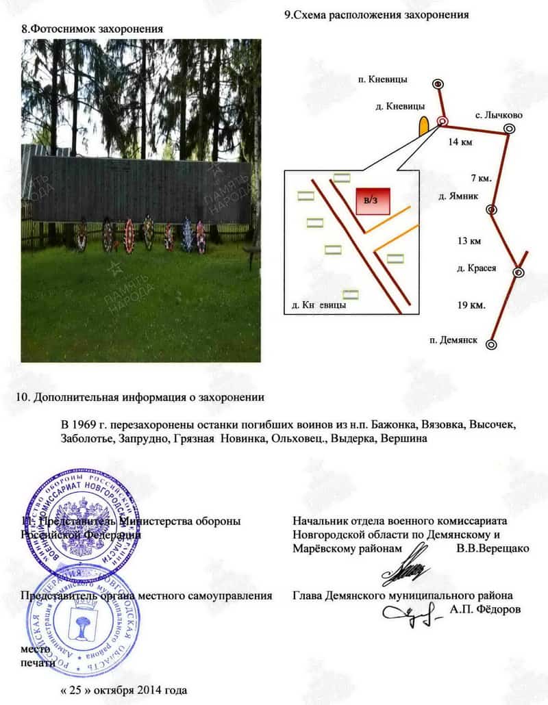 9 мая 1994 года останки лётчика захоронены на Воинском захоронении — братской могиле д. Кневицы Демянского района Новгородской области.