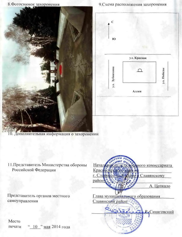 Перезахоронен в Братской могиле ст. Анастасиевской Славянского района Краснодарский края (Захоронение № 90197850).