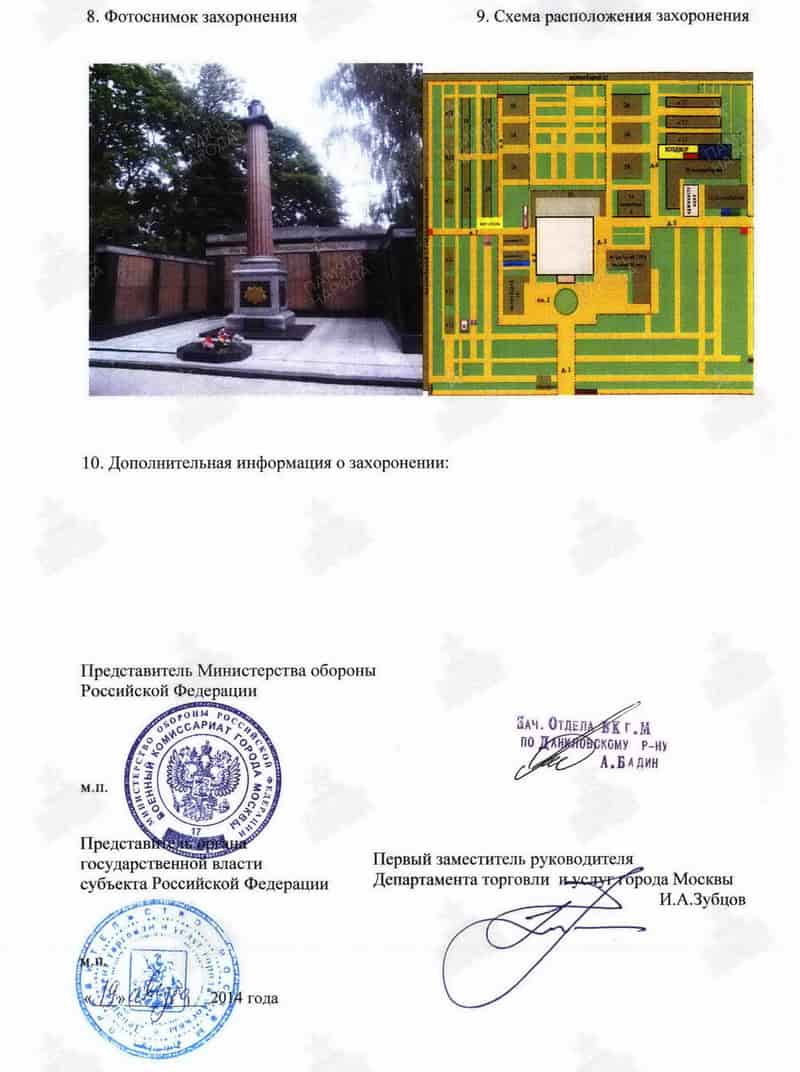 Кремирован в Донском крематории и 09.06.1942 похоронен в Братской могиле (захоронение прахов кремированных воинов) на территории филиала Московского крематория № 1, г. Москва ул. Орджоникидзе дом № 4.