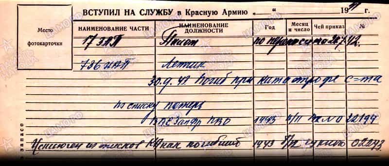 С 23.10.1942 - лётчик 736 иап ЗапФ ПВО.