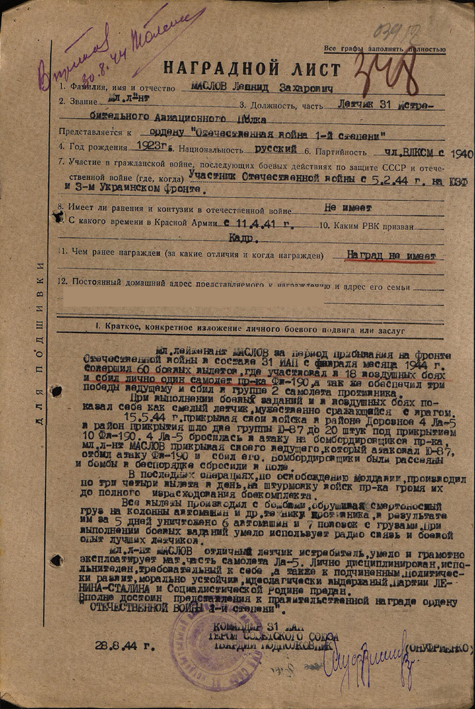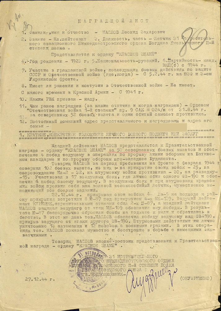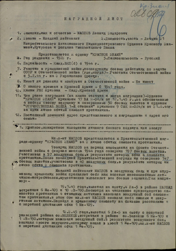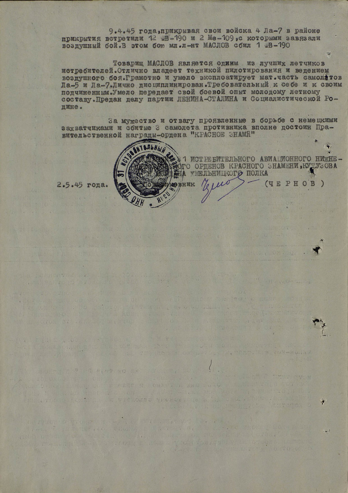 - К боевым заданиям относились полеты на разведку, барражирование, прикрытие войск, штурмовка, а также спецзадания, когда мы сопровождали крупных чинов. «Ли-2» ползет с ними, а ты ножницами его прикрываешь. Прикрывали с особым вниманием, ведь если начальство собьют, потом не расхлебаешься. Однажды даже Жукова прикрывали. Под это дело сразу выдали обмундирование. Но интенданты все разворовали, до нас не дошло, оделось в новое только начальство. А мы так и летали в хлопчато-бумажных гимнастёрках. (Правда, после войны уже нам английскую форму дали. Там был свитер шерстяной и простая куртка на дермантине). Обычно я летал в одном пиджаке или в одной гимнастерке летом. Зимой – в куртке. Шинель снимал, отдавал технику самолета. И с орденами летал.