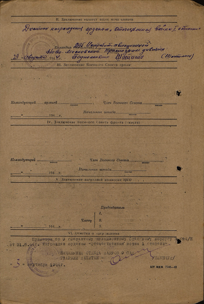 Ещё интересный момент. В нашей дивизии под Никополем организовали эскадрилью асов, куда включили хороших летчиков: Колю Скоморохова, Петю Якубовского, Мишу Цыкина и ещё человека три-четыре. У них была такая же задача, как у немецких асов – свободная охота. С тех пор она у нас охота и пошла. И эскадрилью асов после того, как взяли Днепропетровск, Днепродзержинск, расформировали, и летчиков вернули обратно в свои полки, откуда взяли. Эскадрильей той, кстати, командовал майор Краснов, летчик старый, испытатель. Он нас учил, как летать и как сбивать.