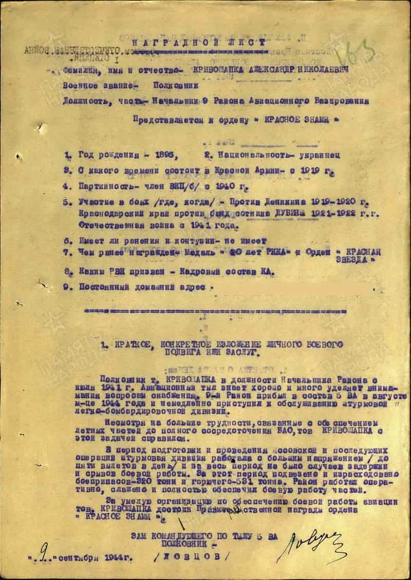09.09.1944 начальник 9-го района авиационного базирования 5-й ВА полковник Кривошапко А.Н. представлен к награде.