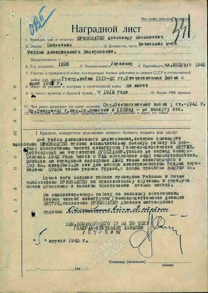 05.04.1945 начальник 9-го района авиационного базирования 5-й ВА полковник Кривошапко А.Н. представлен к награде.
