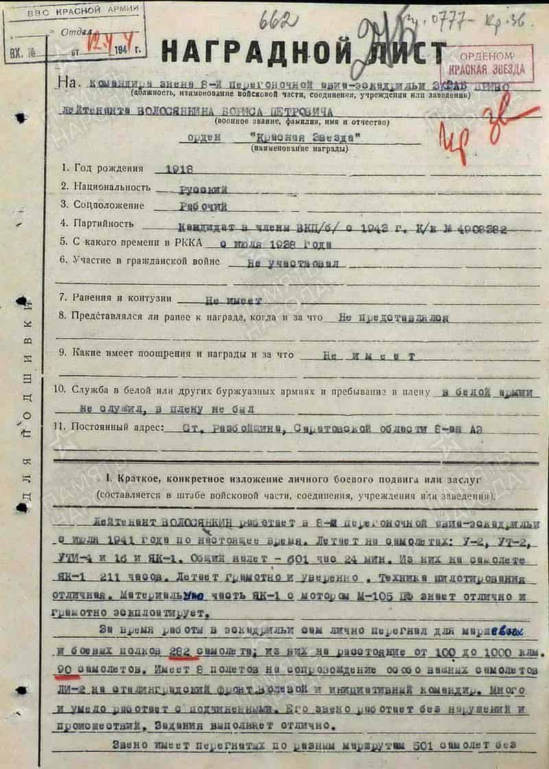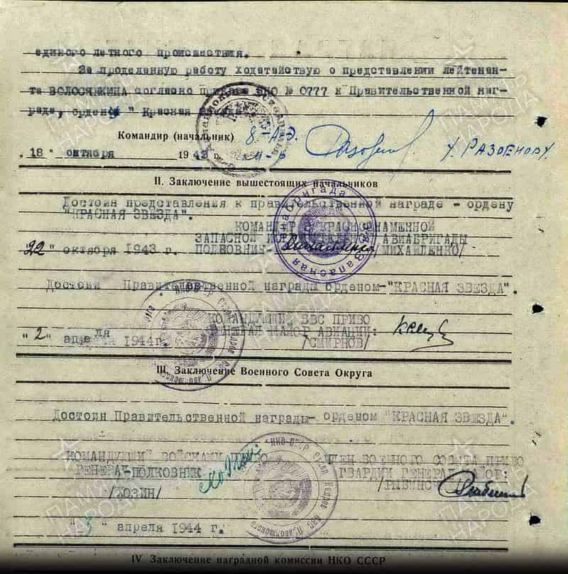 18.10.1943 командир звена 8-й перегоночной авиаэскадрильи 3-й Краснознамённой запасной истребительной авиабригады ВВС Приволжского ВО (ст. Разбойщина Саратовской области Приволжской железной дороги) лейтенант Волосянкин Б.П. представлен к награде.