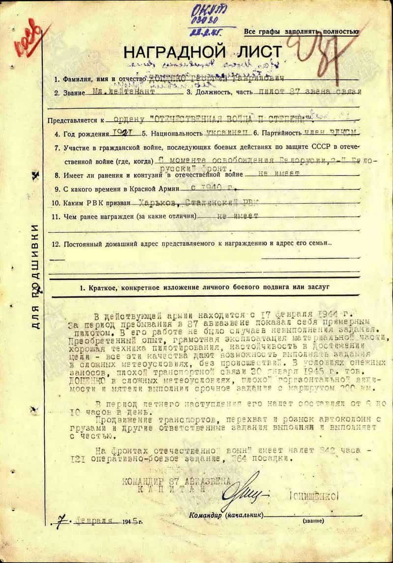 07.02.1945 пилот 87 звена связи, младший лейтенант Доценко Георгий Гаврилович представлен к награде.