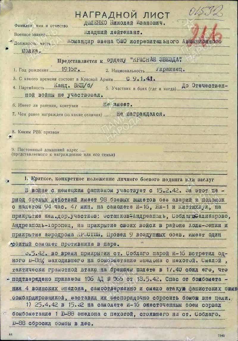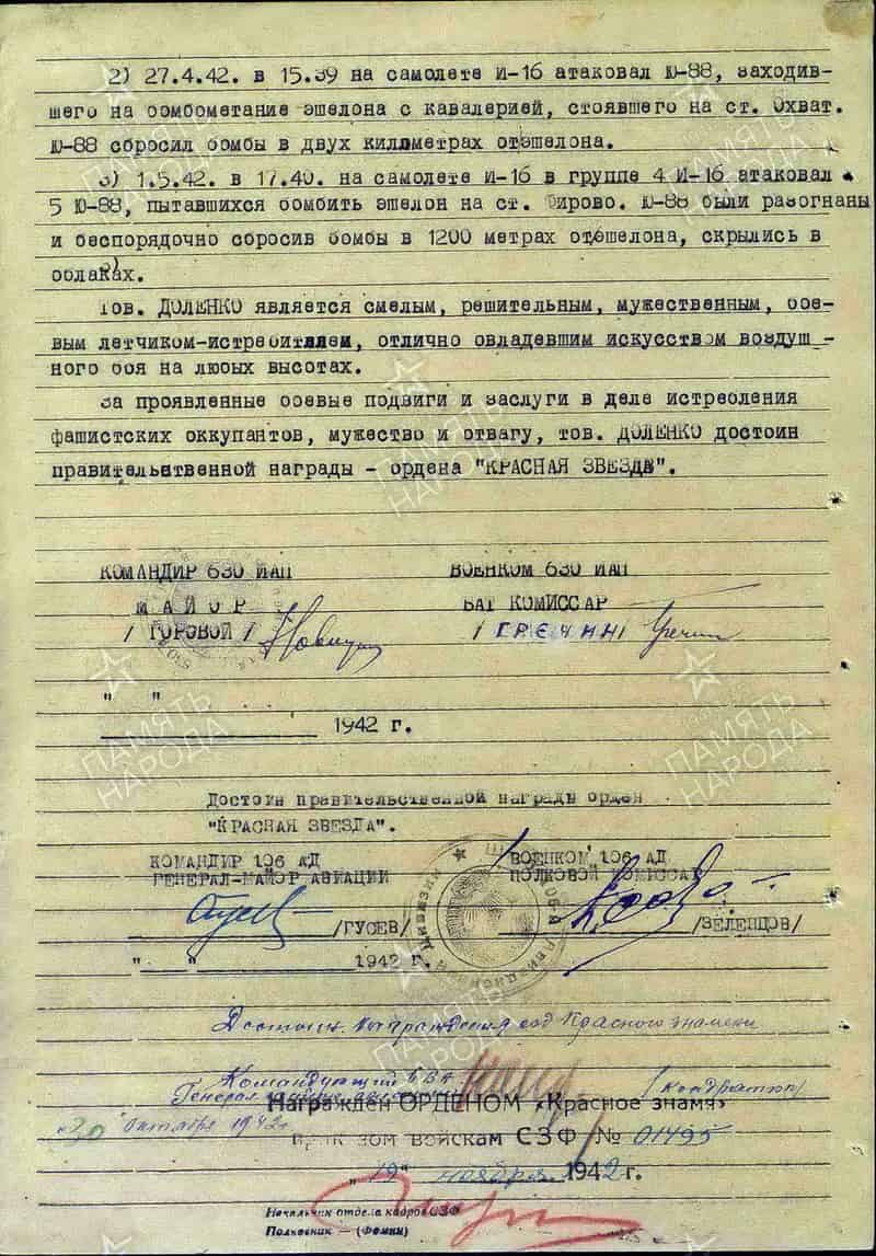 30.10.1942 командир звена 630 иап ПВО младший лейтенант Доленко Н.И. представлен к награде. За время боевых действий выполнил 98 боевых вылетов с налётом 94 часа 47 минут, в 9 воздушных боях сбил 1 самолёт противника в составе группы (по данным наградного листа). Летал на самолётах И-1, Як-1, Киттихаук