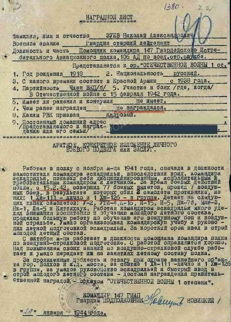 На 20.10.1944 (по данным наградного листа) помощник командира 147 гиап по воздушно-стрелковой службе гвардии старший лейтенант Зуев Н.А. выполнил 77 боевых вылетов, в 7 воздушных боях сбил лично 1 самолёт Хе-111 и 1 самолёт Хш-126 в группе.