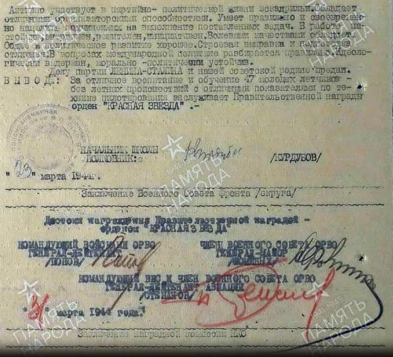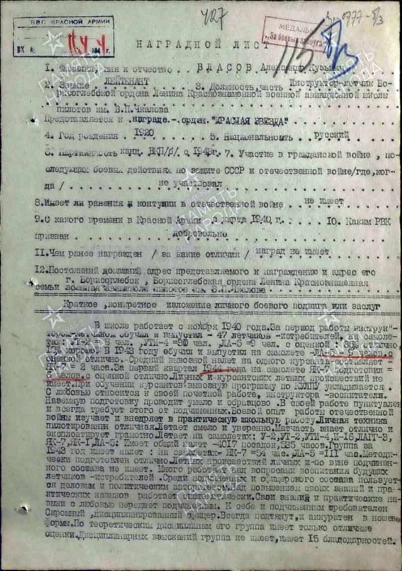 23.03.1944 инструктор-лётчик Борисоглебской ВАШП лейтенант Власов А.К. представлен к награждению орденом Красной Звезды.
