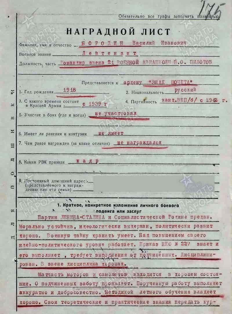 22.02.1943 командир звена 21-й Военной авиационной школе первоначального обучения пилотов представлен к награждению орденом «Знак Почёта».