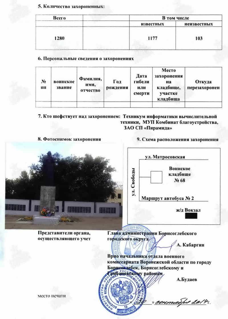Захоронен в Братской могиле № 68 на городском кладбище по ул. Свободы г. Борисоглебска Воронежской области (захоронение № 87415155).