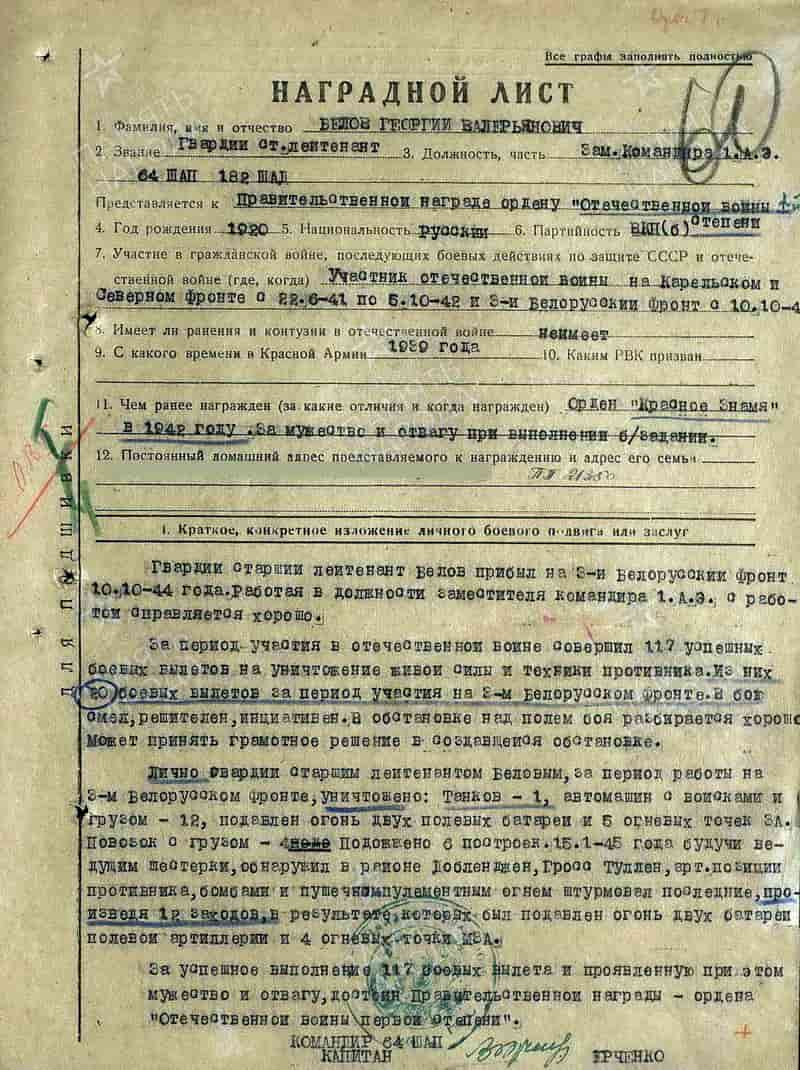В январе 1945 года заместитель командира 1-й эскадрильи 64 шап гвардии старший лейтенант Белов Г.В. представлен к награде.