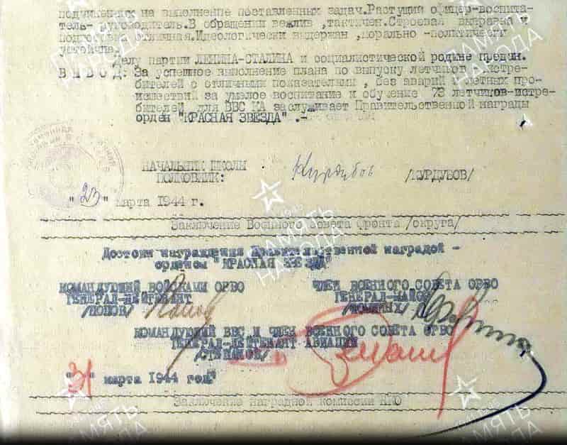 23.03.1944 инструктор-лётчик Борисоглебской ВАШП лейтенант Артёмов И.Д. представлен к награждению орденом Красной Звезды.