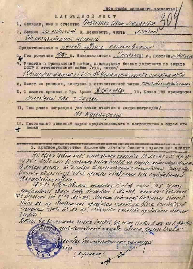 24.01.1945 лётчик 530 иап младший лейтенант Антоненко И.М. представлен к награде: