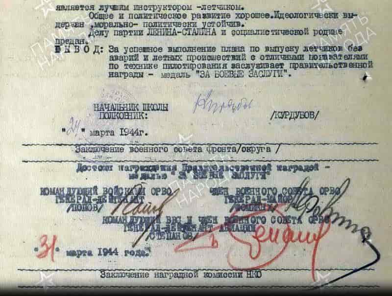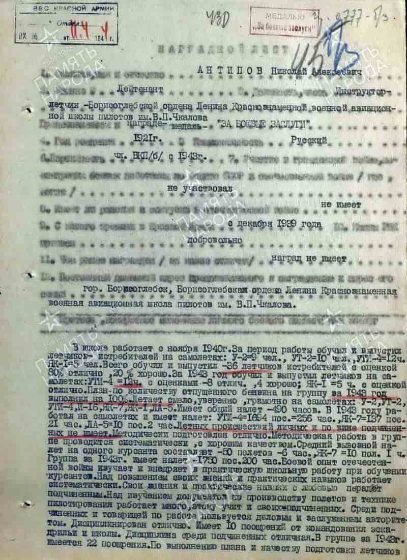 24.03.1944 инструктор-лётчик Борисоглебской ВАП лейтенант Антипов Н.А. представлен к награде.