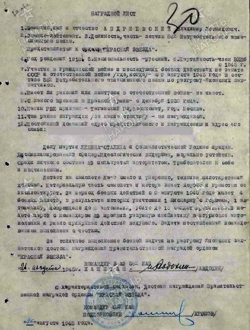 26.08.1945 за выполнение боевых задач по разгрому японских захватчиков представлен к ордену Красной Звезды.