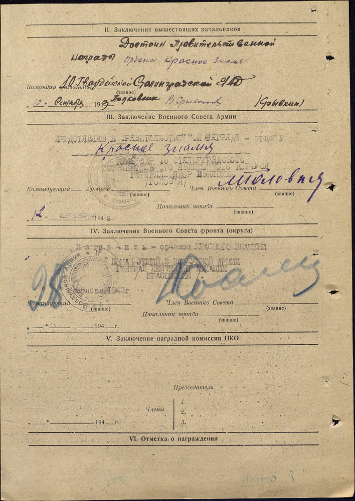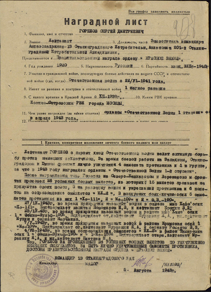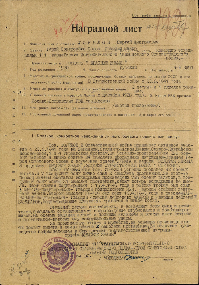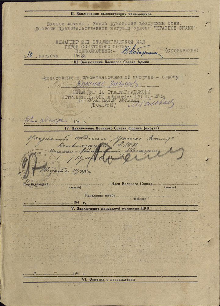 Первый орден Красного Знамени я получил в 1942 году под Сталинградом. К орденам и награждениям все мы относились с чрезвычайным трепетом. Ведь вначале войны награждали скупо. Даже летчиков с медалью «За боевые заслуги» или «За отвагу», уже считали героем. Он- первый человек, ему все можно, да и девки на это обращали внимание.