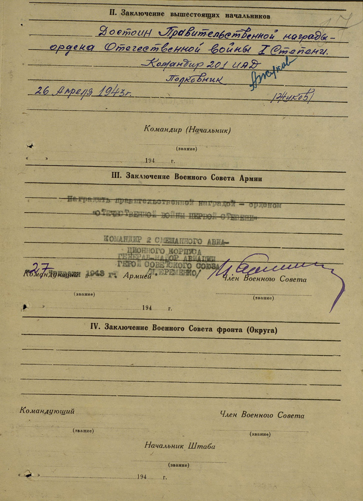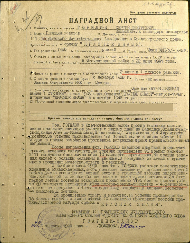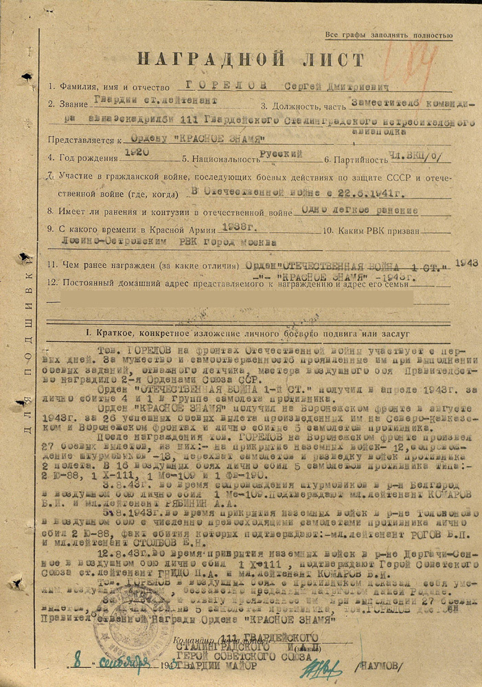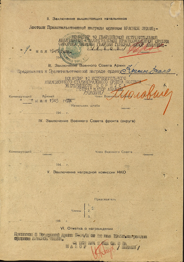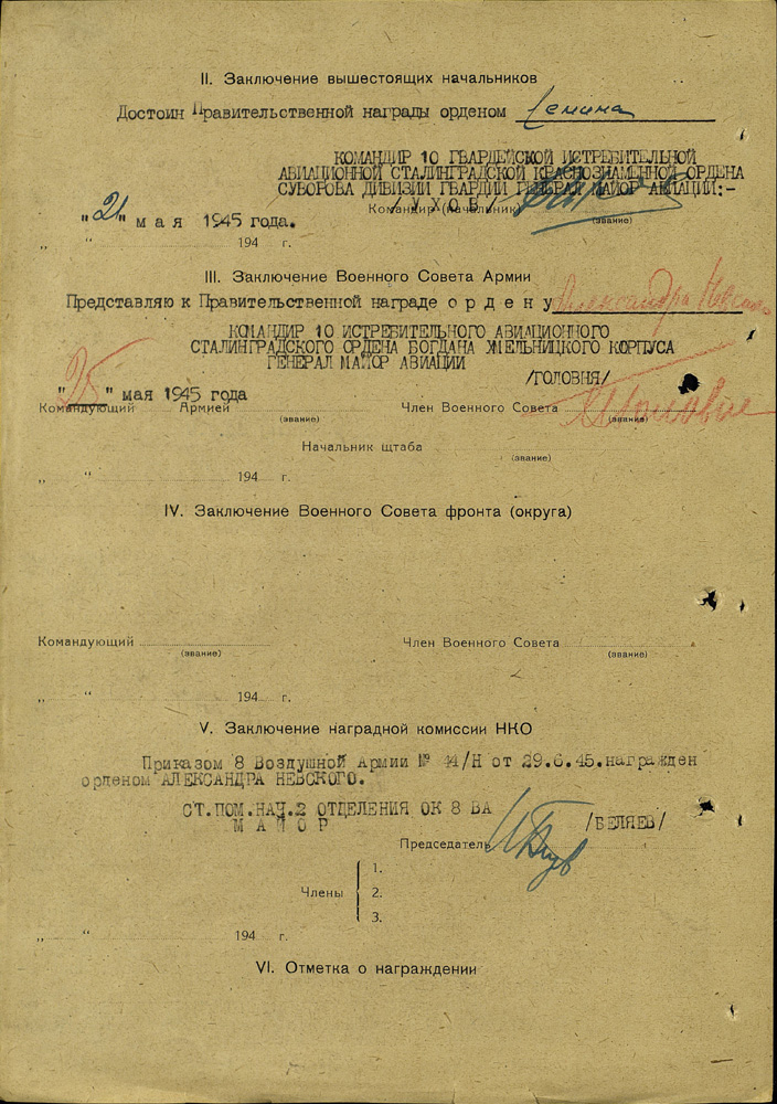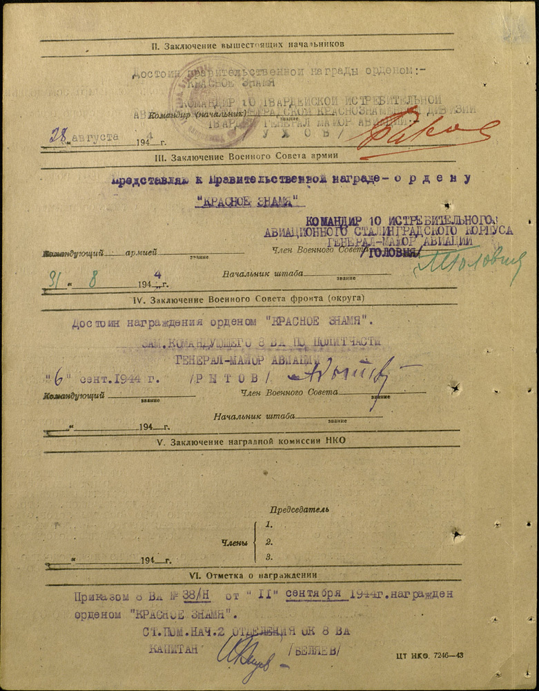 За войну я получил пять орденов Красного Знамени и два - уже после войны. К слову, в бой мы летали с орденами и партийным билетом. Девчата ордена пришивали, чтобы не оторвались (это когда уже колодки пошли). А сначала ордена на винту были, и это нам больше нравилось.