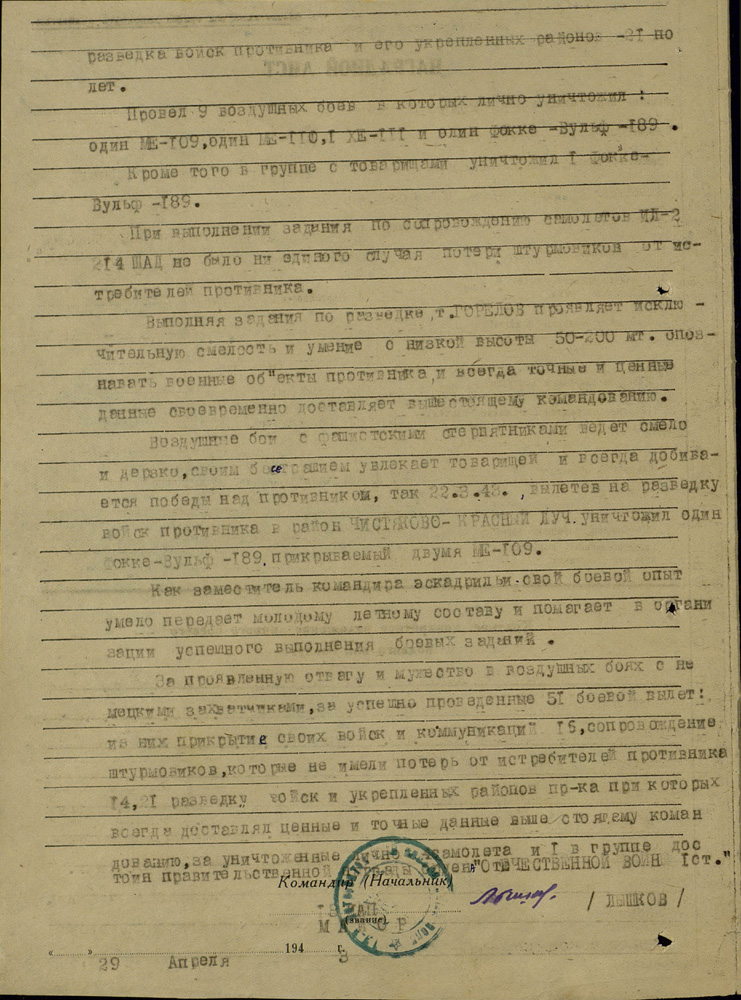 Отношения в полку были не то слово, что хорошие: командиры полка были нам как отцы. Их за годы войну у нас было несколько: Маслов, Холодов, Наумов. Последние два года – Холодов- герой! Очень сильный!.. Командиры полка, как и все, постоянно летали. (Командиры дивизии тоже летали, но реже.) Обычно было: я, командир эскадрильи, одну группу веду, следующую - командир полка.