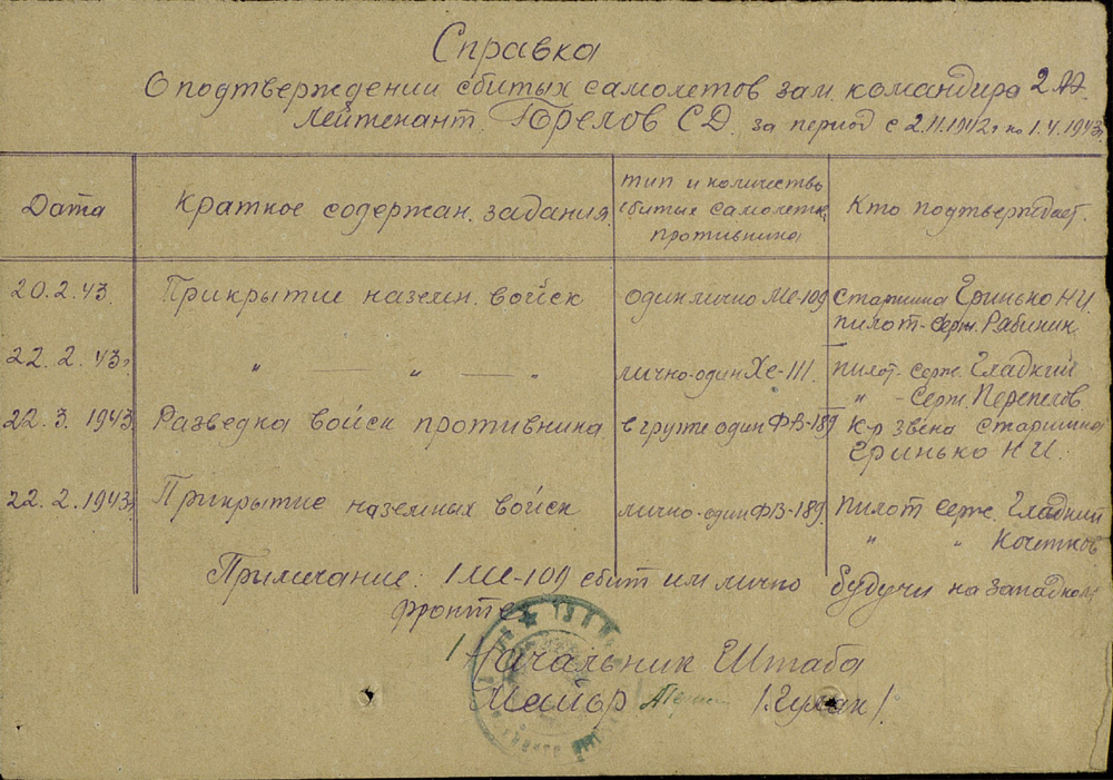 Сбитые самолеты засчитывались так: я, прилетев с задания докладывал, что в таком-то районе сбил такой-то тип самолета; туда оправлялся представитель, который должен был привезти подтверждение от наземных войск, что действительно, такой тип самолета там упал. И лишь после этого тебе засчитывали сбитый самолет. А если самолет падал на вражеской территории, все было сложнее. Чаще всего не засчитывали. В некоторых случаях, когда территорию освобождали, еще можно было привезти подтверждение. А без подтверждения не засчитывали. Даже в конце войны, когда у нас стояли фотокинопулеметы, все равно требовалось подтверждение наземных войск. Вообще, я редко видел, как падают сбитые мной самолеты — только если загорался или терял управление. Сейчас часто спрашивают, были ли приписки к личным счетам. Трудно сказать. Могли быть ошибочные приписки. Умышленно, по-моему, нет. Конечно, летая парой, теоретически можно было договориться приписать сбитие, но если б об этом узнали, житья таким летчикам не было бы. Потерять честь легко, а вот восстановить почти невозможно.