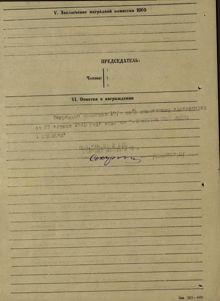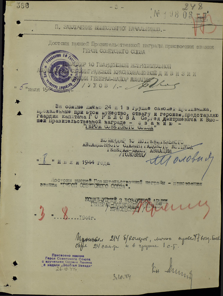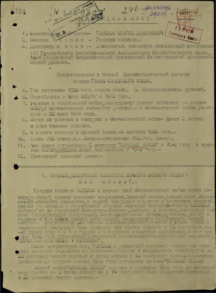За сбитые платили: за истребитель тысячу, а за бомбардировщик две тысячи, за паровоз 900 рублей, за машину 600 рублей. За штурмовки тоже платили. В 1941-ом платили за освоение радиосвязи. Но, знаешь, мы в войну деньги не считали. Нам говорили, что нам причитается столько-то там денег. Мы же их никогда не получали, никогда не расписывались, а деньги шли. Тоже, дураки были, нужно было оформить переводы родителям, а я об этом узнал, только когда отец уже умер. В 1944 году мне присвоили Героя и вызвали в Москву получить Звезду. Летчики, да и техники, зная, что мы летим, и нам нужно ведь будет ее «обмыть», отдали нам свои книжки, по которым мы получили деньги.