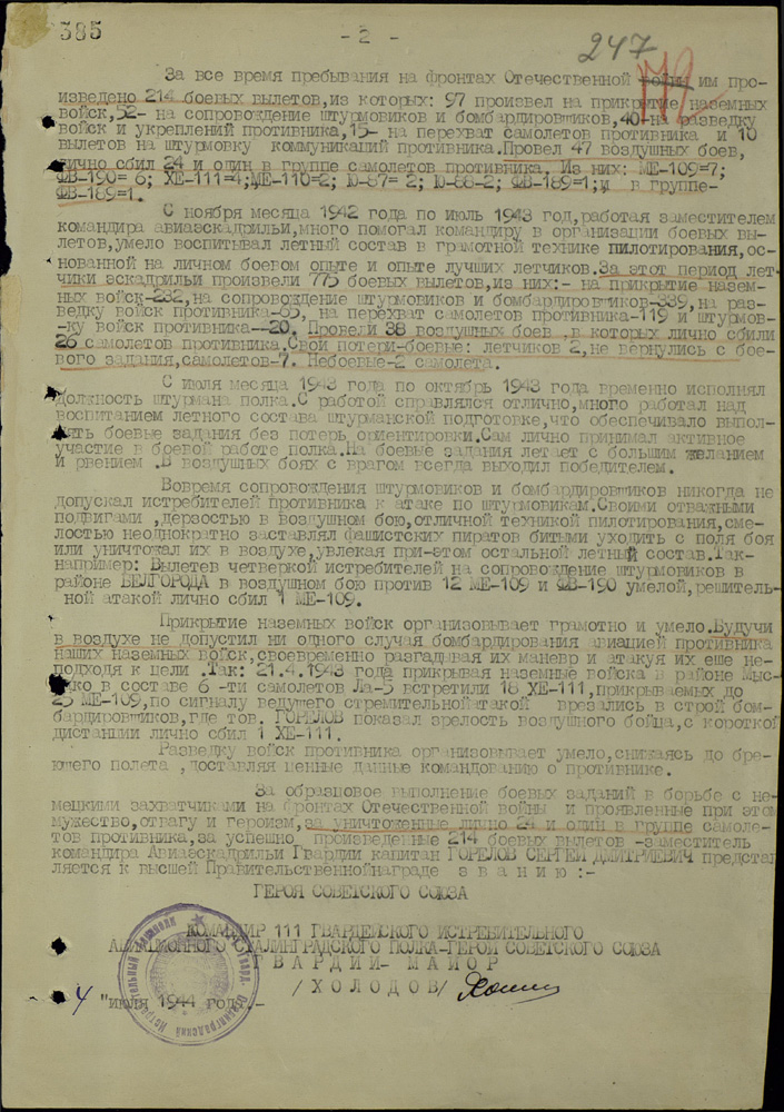 – Под Сталинград мы прибыли в конце августа, после очередной переформировки, в результате которой мы получили «Ла-5». Тут уже жизнь пошла по-другому… Во-первых, у него скорость — почти 700, если с «прижимчиком». Во-вторых, удивительно живучая машина! В одном из воздушных боев под Сталинградом мой самолет получил очередь в двигатель. Кабину начало маслом забрызгивать, а самолёт всё-таки летит! Мне удалось дотянуть до аэродрома и сесть. Двигатель остановился в ходе пробега, и меня притянули меня на стоянку. Заключение техников было таким: ремонту не подлежит. Оказывается, два цилиндра двигателя было отбито! Ты представляешь?! Там только шатуны ходили! Тот же «Як» — стоит осколку попасть в двигатель, зацепить какую-нибудь трубочку и — все. На свободной охоте на «Ла-5» можно было подзаработать, но мы так и продолжали штурмовики сопровождать. Поэтому я и сбил мало.