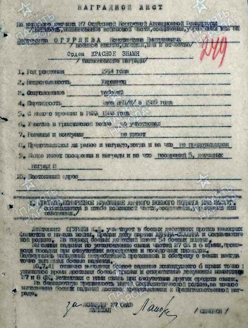 20 мая 1942 года командир звена 47 отдельной корпусной авиационной эскадрильи старший лейтенант Огуряев Константин Дмитриевич не вернулся с боевого задания, попал без вести.