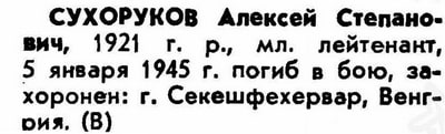 Лётчик 530 иап младший лейтенант Сухоруков Алексей Степанович погиб 5 января 1945 года - не вернулся с боевого задания (пропал без вести) из района Секешвехервар (Венгрия). По списку потерь 17 ВА – вх. № 03226, 1945 г. В некоторых документах указывается первичное место захоронения – Секешвехервар, в других говорится, что А.С. Сухоруков не был захоронен.
